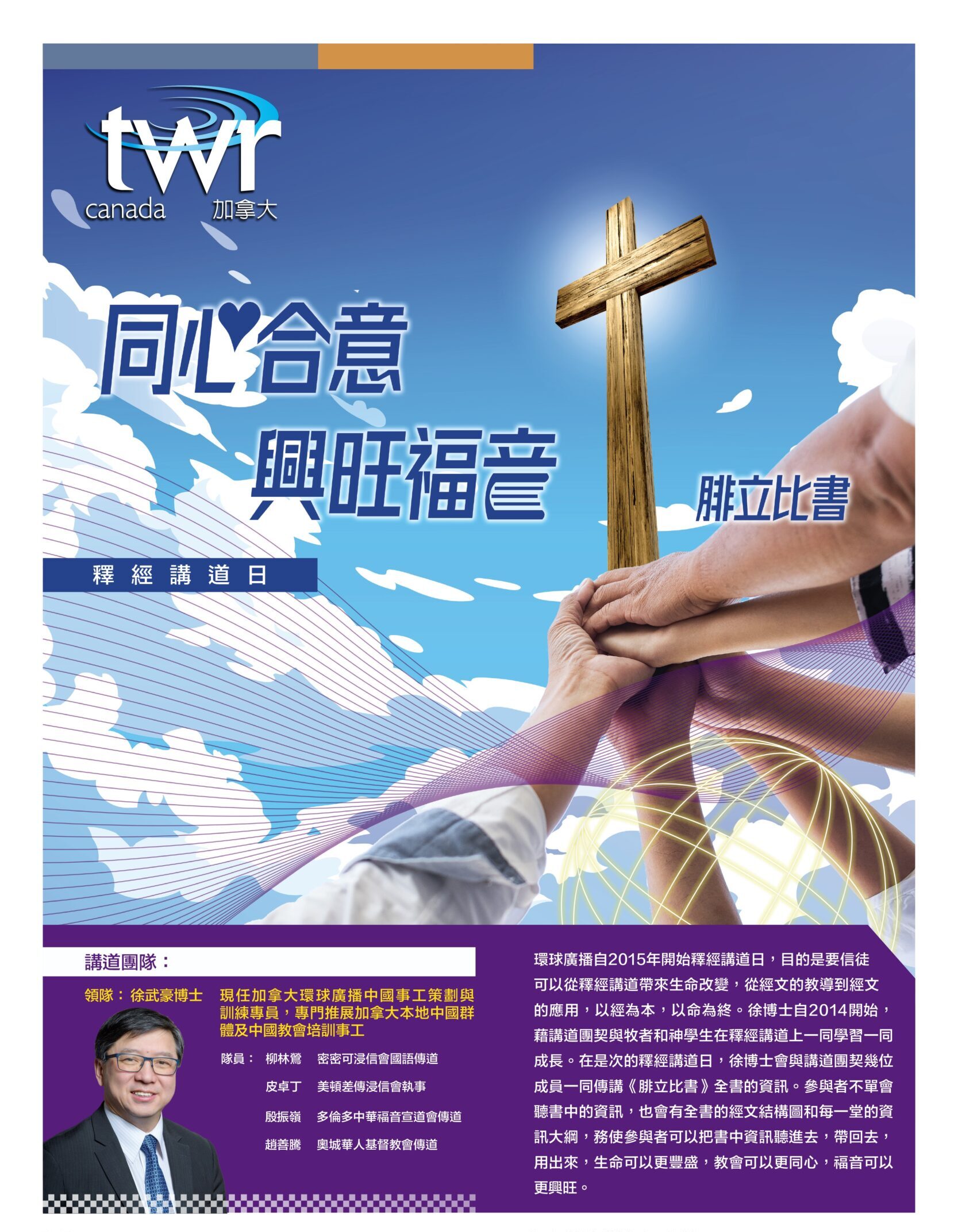 環球廣播自2015年開始釋經講道日,目的是要信徒可以從釋經講道帶來生命改變,從經文的教導到經文的應用,以經為本,以命為終。 徐博士自2014開始,藉講道團契與牧者和神學生在釋經講道上一同學習一同成長。 在是次的釋經講道日,徐博士會與講道團契幾位成員一同傳講《腓立比書》全書的資訊。 參與者不單會聽書中的資訊,也會有全書的經文結構圖和每一堂的資訊大綱,務使參與者可以把書中資訊聽進去,帶回去,用出來,生命可以更豐盛,教會可以更同心,福音可以更興旺。