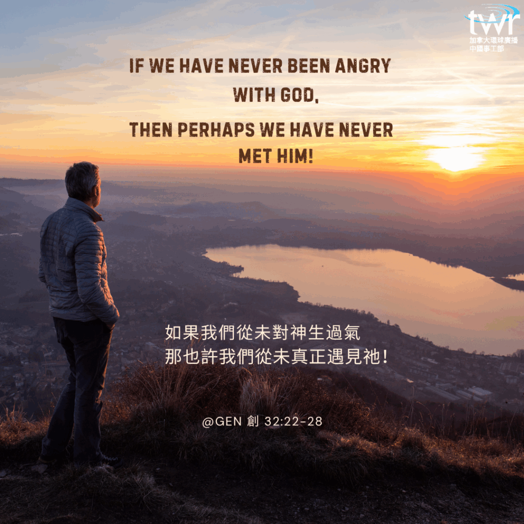 我們與神的相遇可能會起起伏伏;我們與神的對話可以是憤怒也可以是歡喜;可以有控告也可以有崇拜。在雅各與神整夜摔跤之後,他的名字被改為以色列:“與神較力的人”(創32:28)。當我們被巨大的失望、意外的悲痛或突然的背叛所震撼時,我們自然會像亞伯拉罕和以撒、摩西和耶利米一樣問神說: “當我最需要你的時候,你在哪裡?為什麼你讓這件事發生在我身上?”如果我們從未對神生過氣,那也許我們從未真正遇見祂!